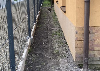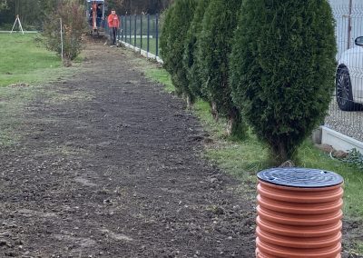 Problemem było zalewanie posesji, ponieważ spusty rynien nie miały odpowiedniego odprowadzenia wody. Wykonaliśmy kompleksowy system odwodnienia – połączyliśmy wszystkie rynny spustowe z dachu, a następnie zamontowaliśmy studnię rewizyjną, do której podpięliśmy odwodnienie. Aby skutecznie odprowadzić wodę, poprowadziliśmy rury na koniec działki i podłączyliśmy je do studni chłonnej, którą również zamontowaliśmy. Efekt? Brak podmakania budynku i skutecznie rozwiązany problem gromadzącej się wody.